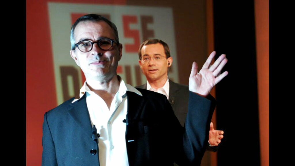 COLUCHE ET THIERRY LE LURON EN 1985, VOUS EVEILLEZ EUX AUSSI, A TRAVERS CETTE PARODIE, POUR VOUS INFORMER, QU’UNE UNION ENTRE DEUX HOMMES, DANS LE FUTUR, ETAIT EN PREPARATION DANS LE CIEL, UN MARIAGE D’AMOUR CELESTE.